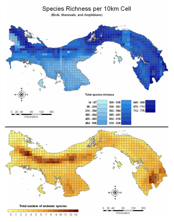 After dividing the country into 10km x 10km grid cells, we used the same species data to determine the species richness (total number of birds, mammals & amphibians) and endemism (number of species that live exclusively in Panama).