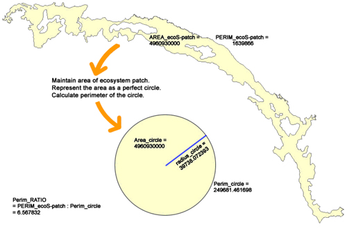 The area for an ecosystem patch is calculated, and then a circle of the same area is produced. The perimeter of the circle is divided by the perimeter of the original ecosystem patch to determine irregularity.